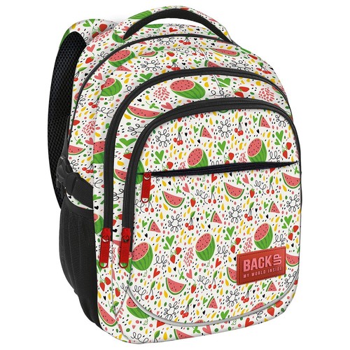 Plecak BackUP model G 60 kremowe tło i czerwone arbuziki zostały ożywione malutkimi wisienkami i truskawkami i wykończone żółtym konfetti. Gumowa naszywka z logo BackUP nadaje plecakowi ciekawego designu. Nazwa wzoru: arbuzy. Wyposażenie: - 3 duże komory - 2 boczne kieszenie na napój - w tylnej komorze kieszenie na laptopa i tablet lub na teczkę i segregator - w trzeciej komorze wygodna kieszeń na zamek - miękkie szelki - wygodny uchwyt do przenoszenia plecaka i dodatkowy uchwyt do powieszenia - usztywnione plecy wyprofilowane oddychającą pianką - dyskretny odblask na szelkach oraz z przodu plecaka - rozmiar: 40x28x18 cm