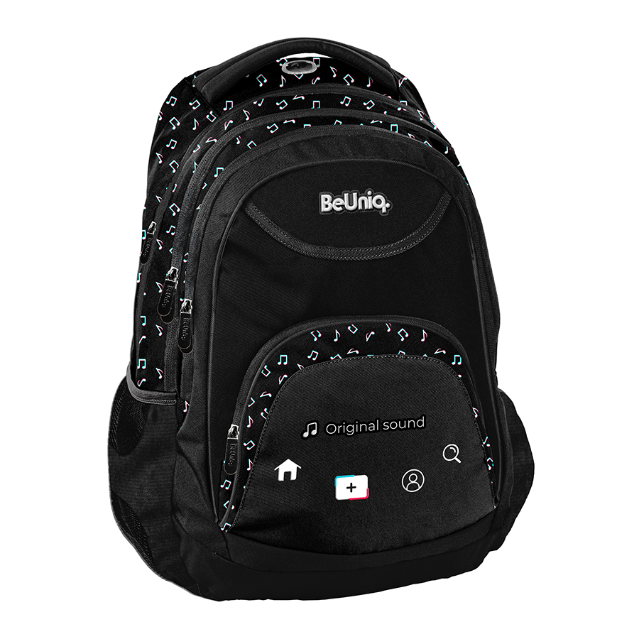 Plecak młodzieżowy Music BeUniq . Posiada trzy pojemne komory, kieszeń przednią z organizerem zamykaną na zamek oraz dwie boczne kieszonki, wykonane z siatki i materiału, które pomieszczą butelkę, bidon czy termos. W komorze głównej, znajduje się przegroda (na laptop). W drugiej komorze organizer z kieszenią na zamek oraz uchwyt na klucze. Wzmocnione profilowane plecy oraz miękkie, regulowane szelki sprawią, że plecak nosi się niezwykle komfortowo. Plecak posiada wygodny uchwyt do przenoszenia, uszko do powieszenia oraz elementy odblaskowe dla większego bezpieczeństwa na drodze po zmroku. Model zawiera usztywniony i wzmocniony spód. Ze względu na swój rozmiar, plecak ten to idealne rozwiązanie dla nastolatków, jak i dla młodszych dzieci.