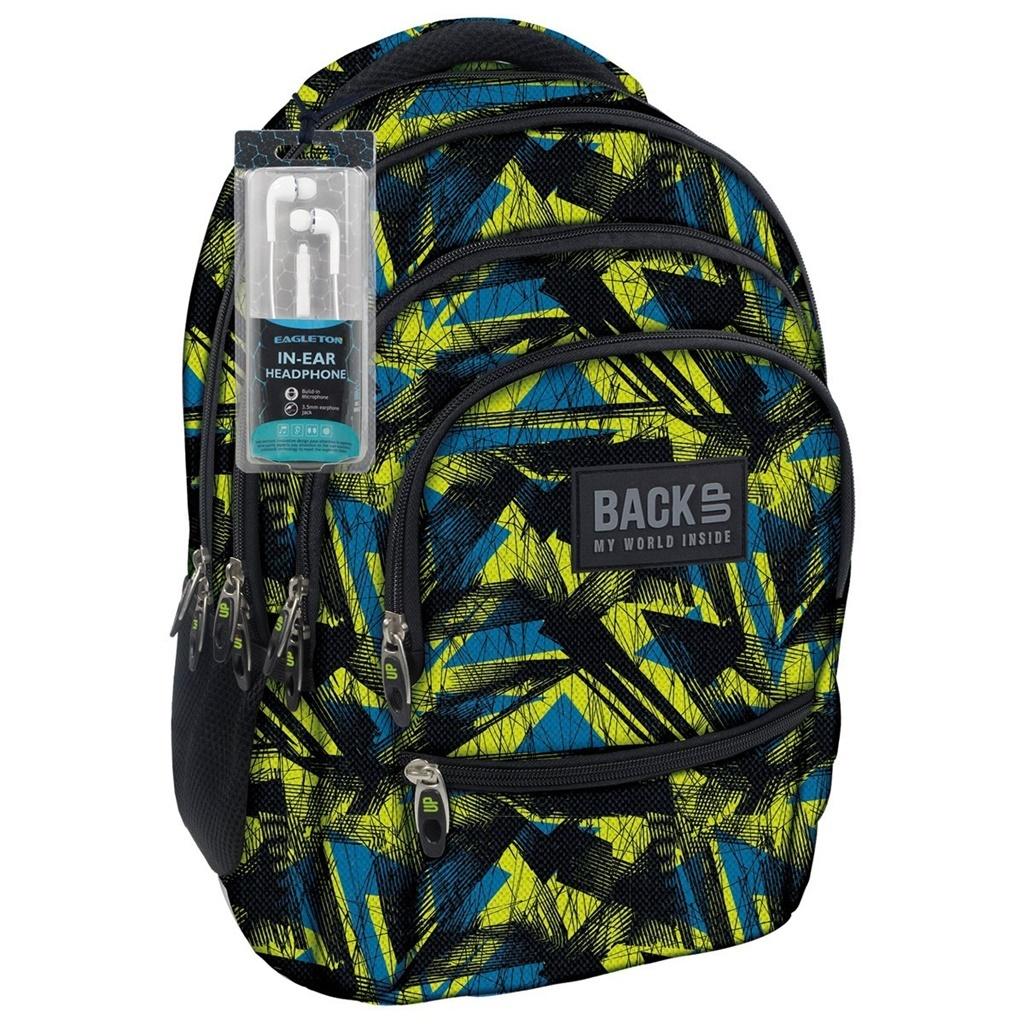 Plecak BackUP model C w bardzo wyraźne, geometryczne wzory w odcieniach zieleni i niebieskiego. W zestawie słuchawki - gratis. Wyposażenie: - 4 duże komory - 1 pojemna, przednia kieszeń - 2 boczne kieszenie na napój - w pierwszej komorze kieszeń na laptopa i tablet - w trzeciej komorze poręczna kieszeń na zamek na drobiazgi - w przedniej komorze poręczny organizer z kieszonką na zamek oraz odczepianym uchwytem na klucze - dno plecaka wykonane ze wzmocnionej tkaniny - miękkie szelki - wygodny uchwyt do przenoszenia plecaka i dodatkowy uchwyt do powieszenia - ergonomiczne, usztywnione plecy wyprofilowane oddychającą pianką - dyskretny odblask na szelkach - rozmiar: 45x32x22 cm BackUP - My world inside Marka młodzieżowa BackUP powstała w oparciu o długoletnie doświadczenie branżowe swojego producenta firmy Derform. W najnowszej kolekcji nawiązano do najmodniejszych światowych trendów odpowiadając tym samym na potrzeby użytkowników. Plecaki tej marki charakteryzują się dbałością o każdy szczegół i troską o zdrowie użytkowników. Uzupełnieniem kolekcji plecaków jest szeroka gama piórników, worków na plecy, kosmetyczkę, toreb fitness oraz toreb sportowych.