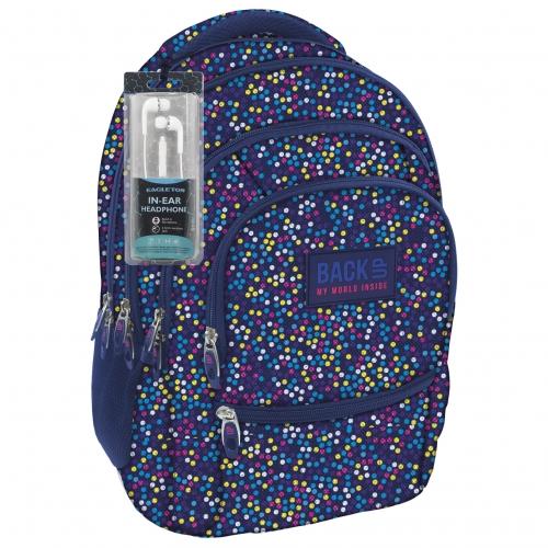 Szkolny plecak BackUP model C w intensywne kolorowe kropeczki na granatowym tle. W zestawie słuchawki - gratis. Wyposażenie: - 4 duże komory - 1 pojemna, przednia kieszeń - 2 boczne kieszenie na napój - w pierwszej komorze kieszeń na laptopa i tablet - w trzeciej komorze poręczna kieszeń na zamek na drobiazgi - w przedniej komorze poręczny organizer z kieszonką na zamek oraz odczepianym uchwytem na klucze - dno plecaka wykonane ze wzmocnionej tkaniny - miękkie szelki - wygodny uchwyt do przenoszenia plecaka i dodatkowy uchwyt do powieszenia - ergonomiczne, usztywnione plecy wyprofilowane oddychającą pianką - dyskretny odblask na szelkach - rozmiar: 45x32x22 cm BackUP - My world inside Marka młodzieżowa BackUP powstała w oparciu o długoletnie doświadczenie branżowe swojego producenta firmy Derform. W najnowszej kolekcji nawiązano do najmodniejszych światowych trendów odpowiadając tym samym na potrzeby użytkowników. Plecaki tej marki charakteryzują się dbałością o każdy szczegół i troską o zdrowie użytkowników. Uzupełnieniem kolekcji plecaków jest szeroka gama piórników, worków na plecy, kosmetyczkę, toreb fitness oraz toreb sportowych.