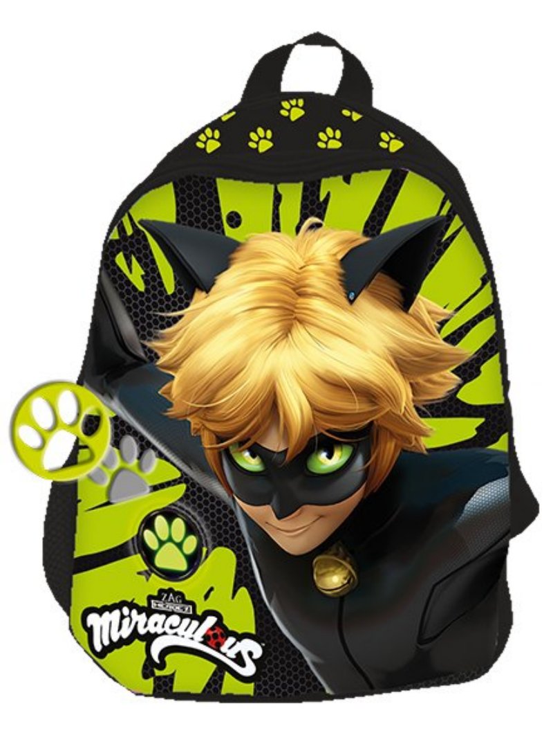 PLECAK MAŁY 2-komorowy, na boku posiada kieszonkę z elastycznej siatki. Na froncie plecaka oraz na szelkach znajdują się elementy odblaskowe. Całość wykonana z poliestru. Wewnątrz plecaka kolorowa grafika. Dodatkowo zamki zakończone są ozdobnymi zawieszkami. Wysokość: 29 cm