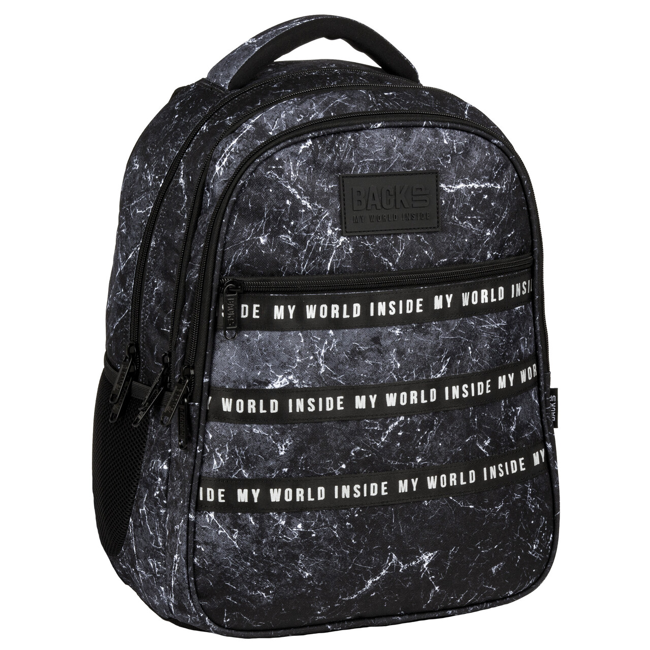 Ciemny plecak w marmurkowy, monochromatyczny wzór, wzbogacony o 3 taśmy z odblaskowym napisem. Nazwa wzoru terra.