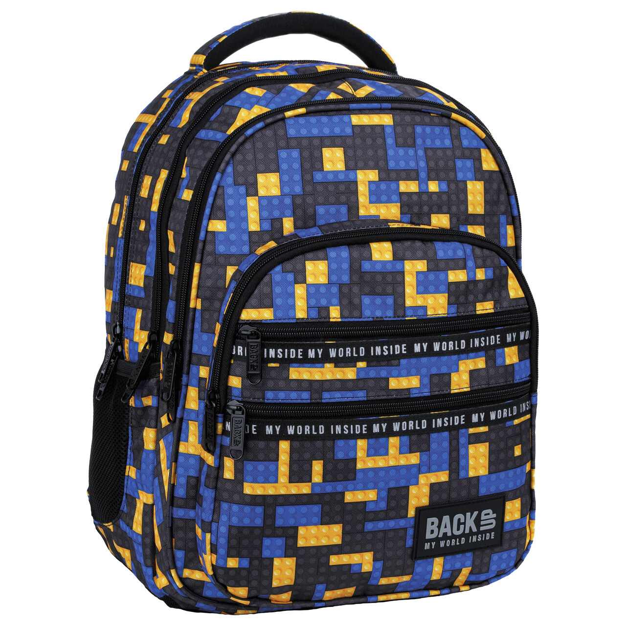 Zbudowany z niebieskich, żółtych i czarnych klocków. Zdecydowany hit sezonu! Przeszyty odblaskowymi taśmami. Wzór: bricks.