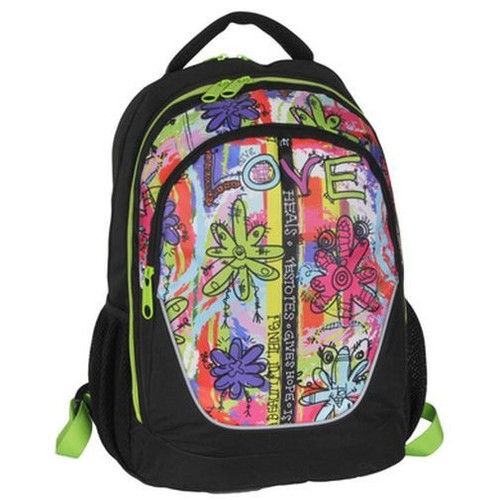 Plecak szkolny. Posiada dwie komory główne, jedną kieszeń z przodu, boczne kieszenie z siatki, sztywne, ergonomiczne plecy pokryte siatką, profilowane szelki, sztywne dno, elementy odblaskowe.