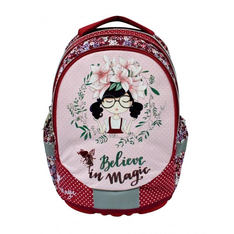 Bezkonkurencyjny plecak ergonomiczny przeznaczony dla klas 1-3. Wykończony z dbałością o szczegóły, z najwyższej jakości materiałów. Posiada solidne, grube suwaki metalowe z wygodnymi dla dzieci uchwytami. Jest niewiarygodnie lekki w porównaniu do tradycyjnych tornistrów oraz posiada ergonomicznie ukształtowane plecy z trwałej, oddychającej gąbki, ze specjalnym systemem AIR-SYSTEM *MESH BACK COOLING* STREET®. Sztywna podstawa z nóżkami oraz podwójna regulacja szelek sprawia, że jest to najlepszy wybór plecaka dla naszych pociech – tych najmniejszych pierwszoklasistów jak i trochę większych trzecioklasistów. Dodatkowo atrakcyjny kwiecisty wzór poruszający każde artystyczne serce. Modny akcent ze śliczną dziewczynką w okularach i napisem ‘believe in magic’ pozwoli się przenieść w krainę marzeń i baśni, w każdej wolnej chwili. Cały przód jest pokryty delikatnym brokatem dzięki czemu daje niesamowity efekt w słońcu. Cechy plecaka: - rewolucyjnie niska waga zaledwie 650 g ! - komora główna z przegrodą na ćwiczenia i podręczniki - pojemna komora przednia zamykana na zamek błyskawiczny - pojemna komora przednia zamykana na zamek błyskawiczny - dwie kieszenie boczne z wytrzymałego materiału na bidon i akcesoria - sztywna podstawa z nóżkami - sztywne, ergonomicznie ukształtowane plecy z systemem AIR-SYSTEM *MESH BACK COOLING* STREET®. - szerokie, grubo wyściełane szelki oddychające z podwójną regulacją dla wyższych i niższych dzieci - szeroki uchwyt oddychający do przenoszenia plecaka w ręku - elementy odblaskowe z każdej strony plecaka zwiększające bezpieczeństwo dzieci na drodze - uchwyty na zapinki oraz karabińczyki - wygodne dla dzieci gumowe uchwyty do przesuwania suwaków z logiem STREET - atrakcyjne dla dzieci aplikacje dekoracyjne 2 lata gwarancji. Wymiary: 36 x 22 x 42 cm Waga: 650 g