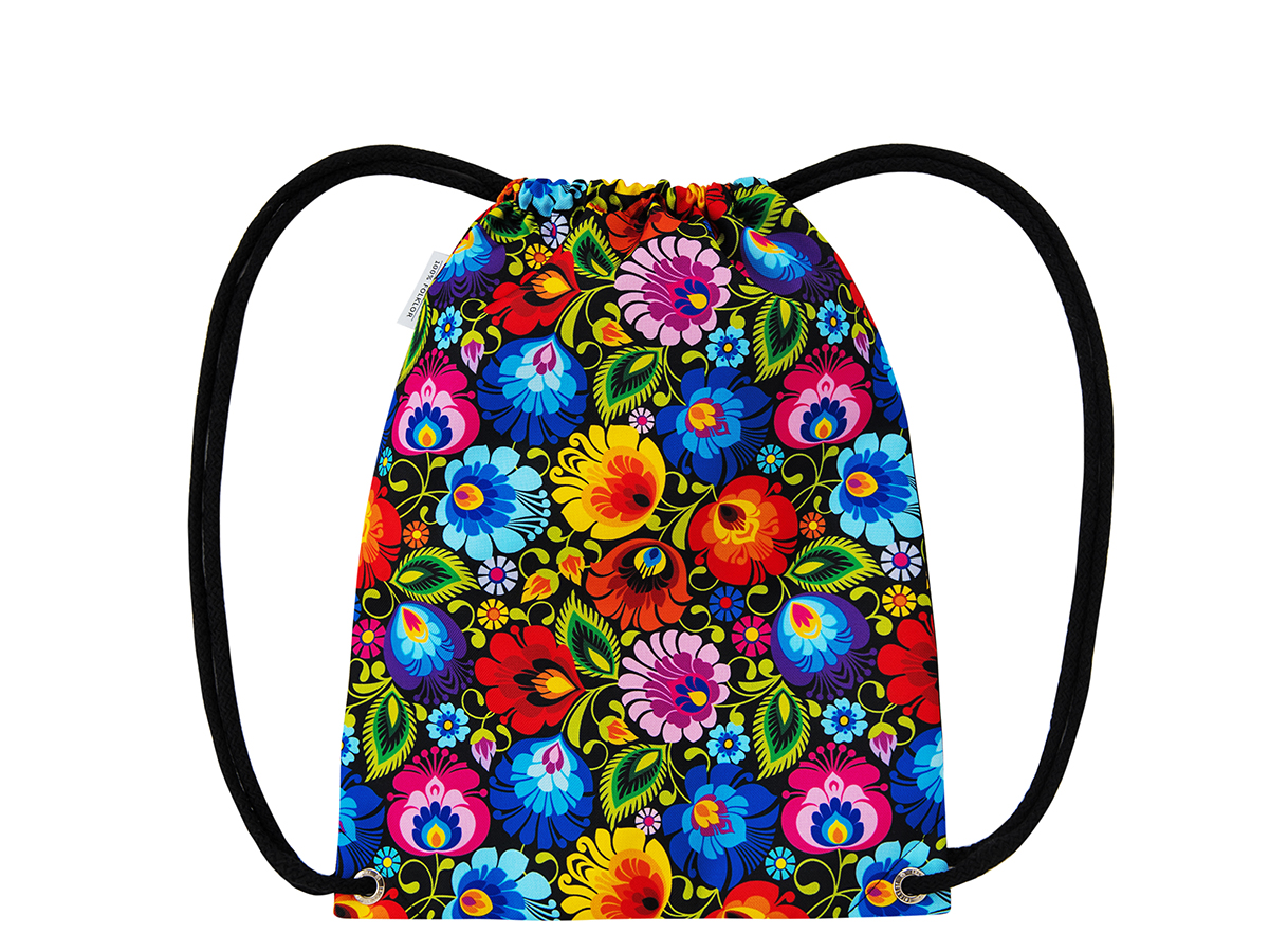 Plecak z nadrukowanym łowickim wzorem na czarnym tle. Motyw zdobiący ludowy plecak inspirowany jest tradycyjnymi wycinankami łowickimi - najbardziej rozpoznawalnym symbolem polskiego folkloru. Podstawowymi elementami wycinanek łowickich są koguty, pawie oraz motywy kwiatowe. Wycinanki tworzone są ręcznie z kolorowego papieru, a sztuka ta przekazywana jest z pokolenia na pokolenie. Elementy kwiatów oraz kogutów łowickich można znaleźć w łowickich stylizacjach zaprojektowanych przez Folkstar.