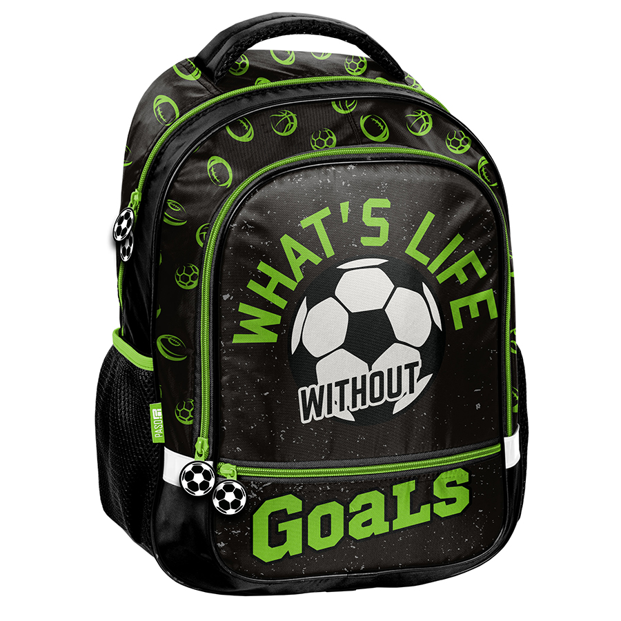 Plecak dwukomorowy szkolny, jedna płaska mała kieszeń na froncie, dwie boczne kieszenie z siatki (mieszczą małą butelkę, bidon lub termos). Elementy odblaskowe, usztywnione plecy pokryte siatką. Wygodny uchwyt do przenoszenia. Wygodne pullery ułatwiające odpinanie zamków.