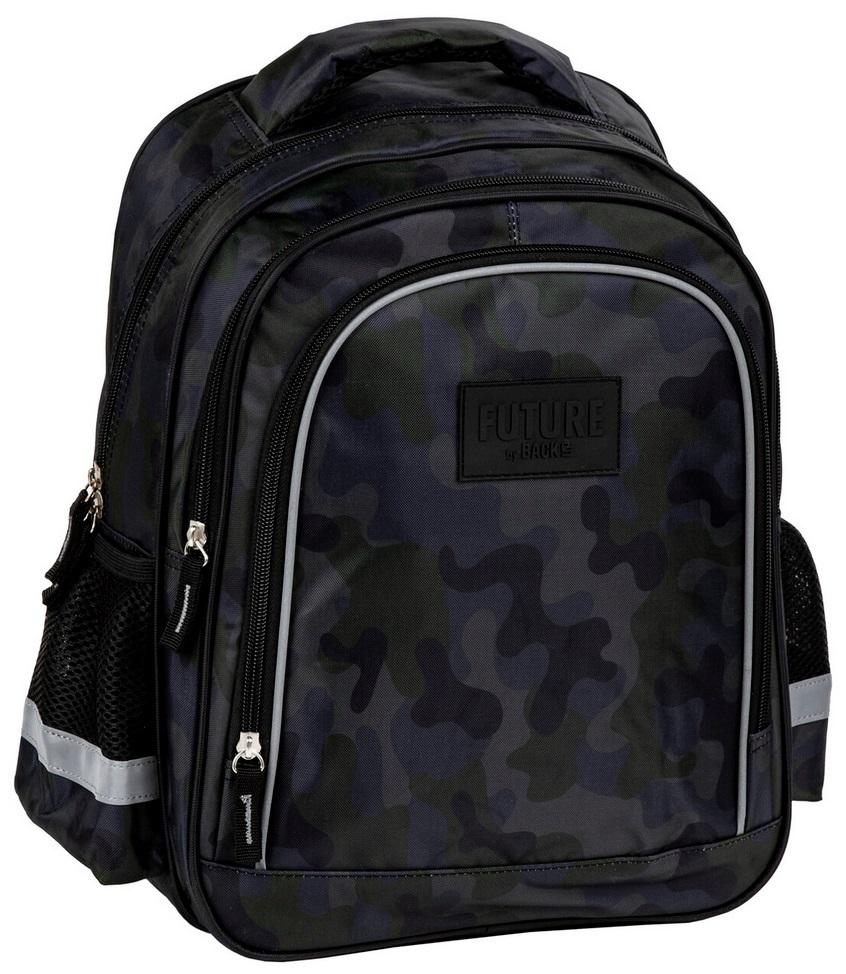 Dwukomorowy plecak szkolny z obszerną kieszenią przednią. Po bokach znajdują się dwie boczne kieszonki wykończone siatką. Plecak posiada miękkie wyściełane szelki, ergonomiczne plecy, taśmy odblaskowe, wzmacnianą rączkę oraz wzmacniane dno.