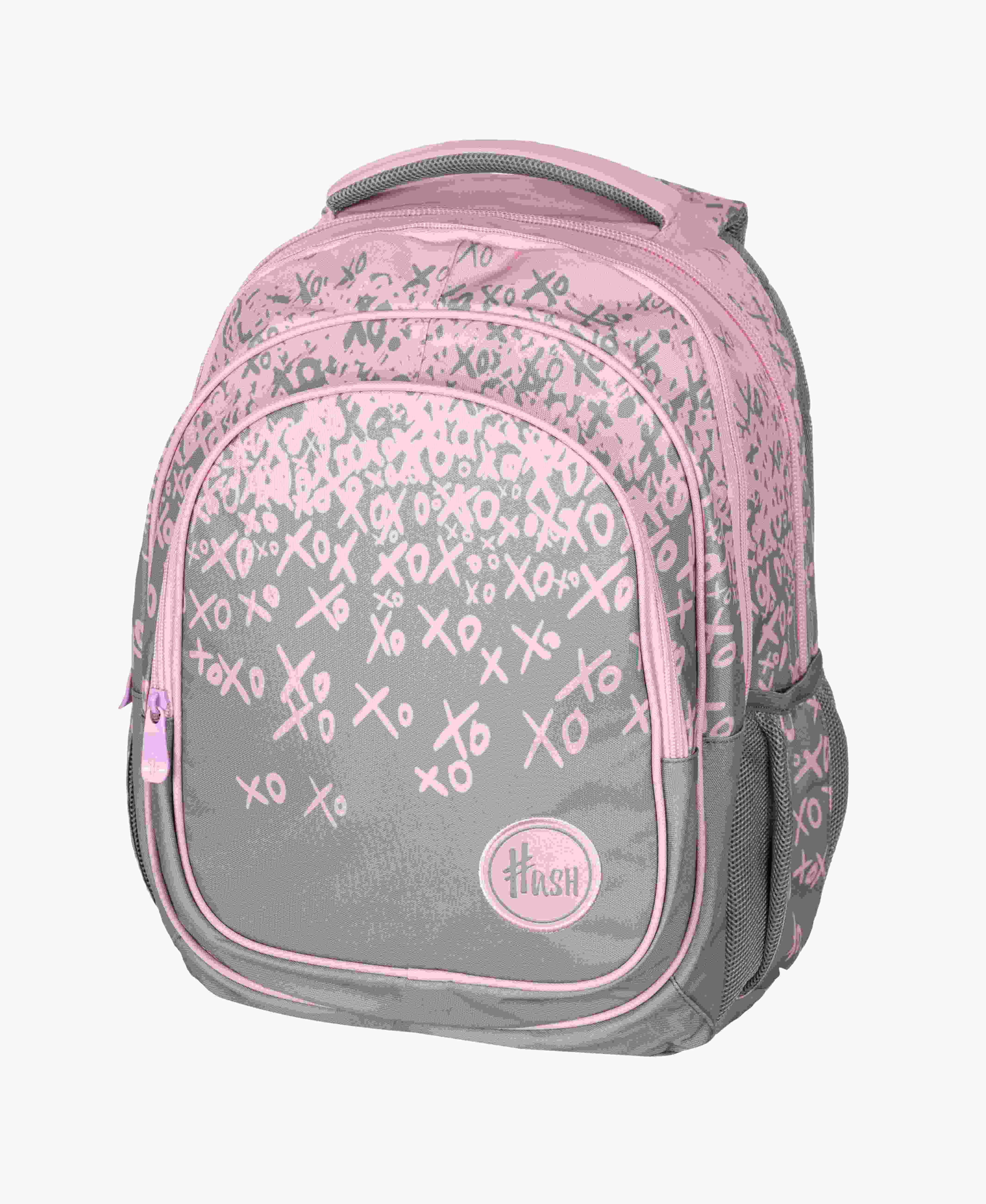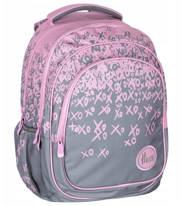 Trzykomorowy plecak Hash w efektownej szaro-różowej kolorystyce z motywem graficznym stworzonym z napisów XOXO. Plecak Hash posiada trzy funkcjonalne komory wyposażone w praktyczną kieszonkę oraz organizer na drobiazgi. Zastosowano w nim najnowszą technologię Ergo Back minimalizującą naciski na barki i kręgosłup oraz zapewniającą poczucie komfortu dziecka. 3 komory 2 kieszenie zewnętrzne – siatki 1 dodatkowa kieszeń wewnętrzna zadruk ombre przegroda na laptop w środku przedniej komóry przegródki na przybory, telefon, karabińczyk na klucze profilowane, ergonomiczne plecy miękkie szelki z regulacją długości materiał wodoodporny elementy odblaskowe Wymiary: 42 x 30 x 19 cm