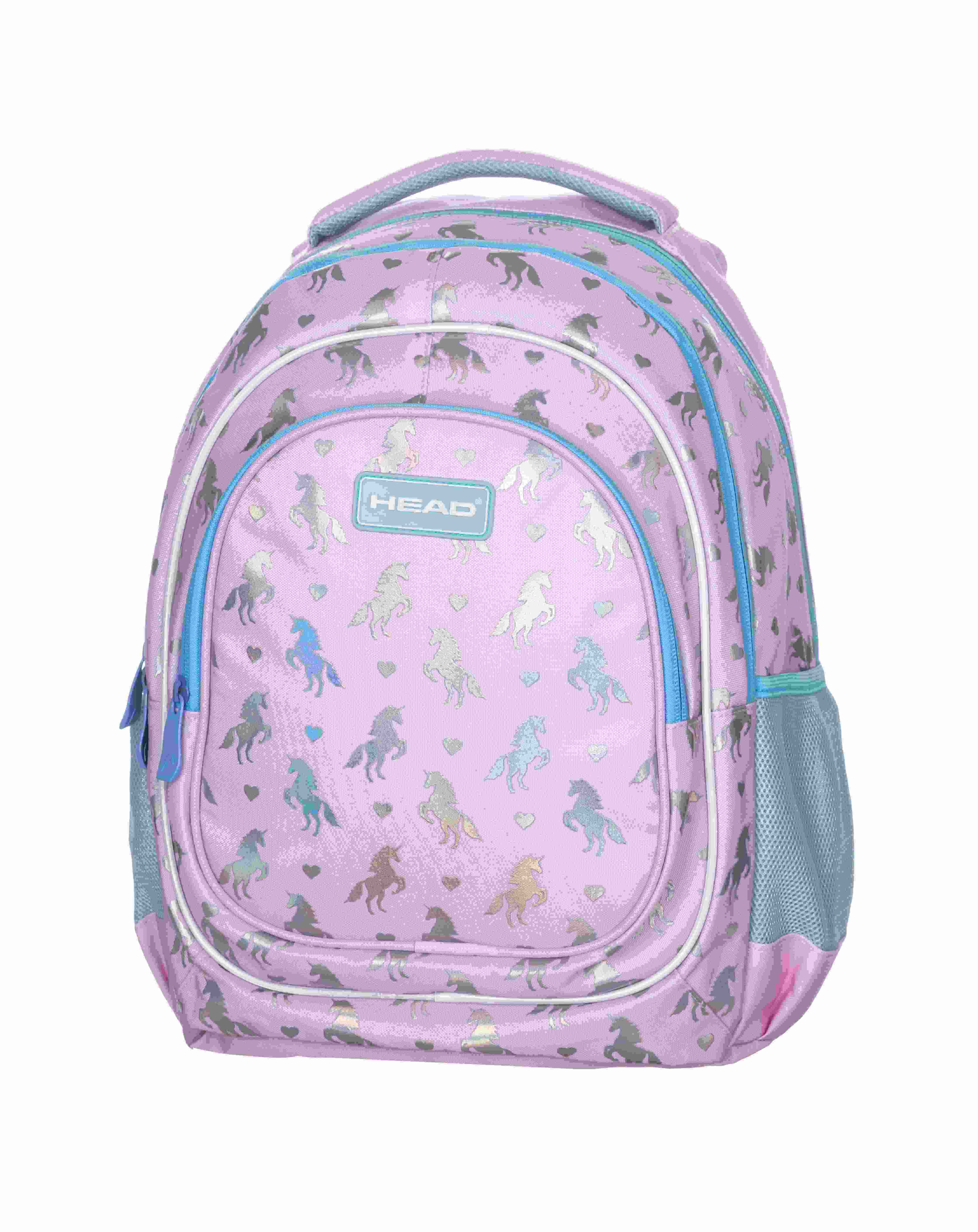 Trzykomorowy plecak Head w magnetycznej różowo-miętowej kolorystyce to marzenie każdej dziewczynki. Jego znakiem rozpoznawczym są małe jednorożce z holograficznym motywem, mieniącym się tysiącem kolorów.Plecak Head posiada trzy funkcjonalne komory wyposażone w praktyczną kieszonkę oraz organizer na drobiazgi. Zastosowano w nim najnowszą technologię Ergo Back minimalizującą naciski na barki i kręgosłup oraz zapewniającą poczucie komfortu dziecka. 3 komory 2 kieszenie zewnętrzne- siatki organizer z brelokiem na klucze w przedniej komorze metalowe uchwyty do suwaków kolorowa, zadrukowana podszewka holograficzny efektowny zadruk profilowane, ergonomiczne dodatkowo usztywnione plecy miękkie szelki z regulacją długości wzmocniony uchwyt materiał wodoodporny elementy odblaskowe z przodu i na szelkach gumowe nóżki na spodzie chroniące przed przetarciami Wymiary: 39 x 28 x 15 cm