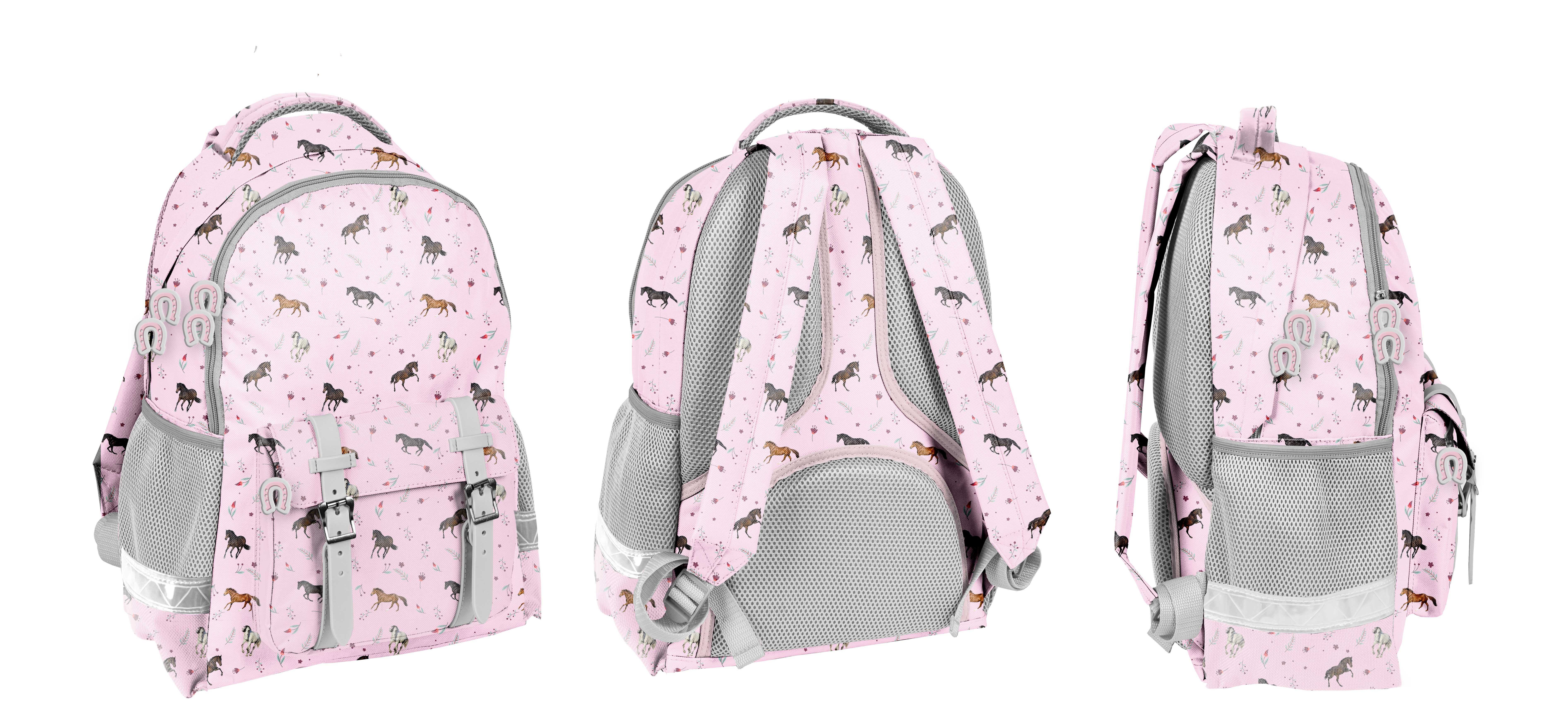 Plecak szkolny. Wyposażony w dwie pojemne komory oraz boczne kieszonki wykonane z siatki na bidon lub termos. Na froncie znajduje się zamykana na zamek kieszeń z dodatkowymi ozdobnymi klamrami zapinanymi na magnes. Plecak posiada wzmocnione, profilowane plecy, miękkie, regulowane szelki oraz wygodne uszko do powieszenia i ozdobne pullery