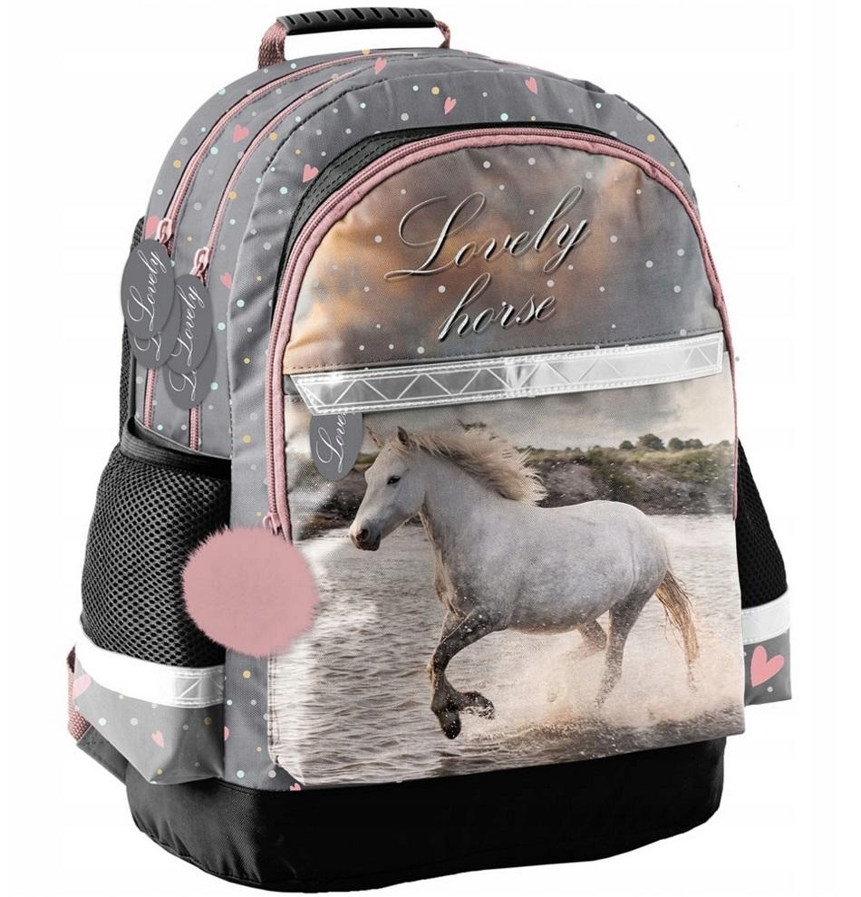 Plecak szkolny z dwoma komorami dużymi, dwoma kieszeniami na przodzie, bocznymi kieszonkami z siatki. Usztywnione, ergonomiczne wyprofilowane plecy i szelki. Plecy i szelki pokryte miękkim materiałem. Usztywnione denko. Elementy odblaskowe.