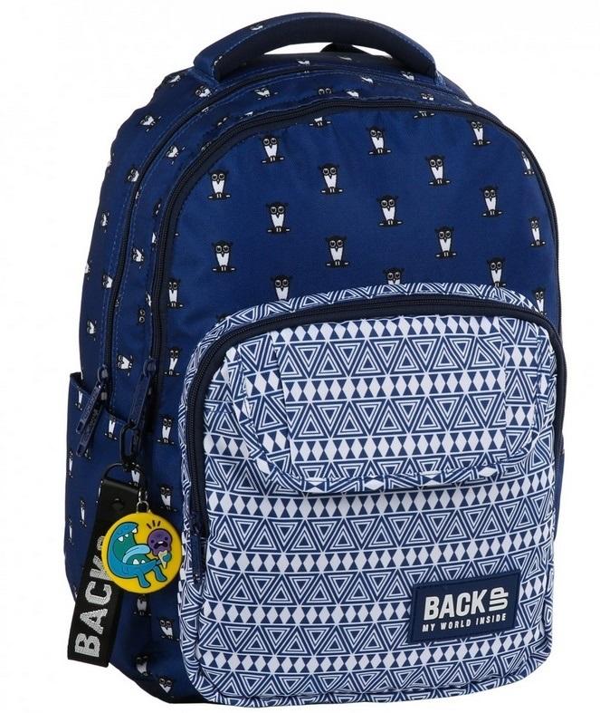 Pojemny i funkcjonalny plecak szkolny przypadnie do gustu każdemu. Plecak charakteryzuje staranne wykonanie oraz wspaniały wzór w sowy na granatowym tle. Materiał z którego plecak uszyto jest wodoodporny i wytrzymały. Plecak jest pojemny, posiada 3 duże komory. W jednej z komór znajduję się duża zakładka na format A4 na laptop oraz na tablet; druga pojemna komora również swobodnie mieści format A4 oraz posiada małą kieszonkę zapinaną na zamek. Posiada również poręczny organizer z dwoma kieszonkami na zamek oraz karabińczykiem na klucze. Na froncie znajduje się wygodna kieszeń zapinana na rzep. Po bokach plecak posiada dwie otwarte, materiałowe kieszenie na butelkę wody lub bidon. Wszystkie suwaki zakończone są dużymi poręcznymi pullerami. Tył plecaka jest usztywniony i pokryty oddychającym materiałem. Szelki są szerokie, miękko wyściełane pokryte od spodu oddychającym materiałem. Spód plecaka wzmocniony jest pianką. U góry plecak ma wszyty miękko wyściełany uchwyt do przenoszenia oraz dodatkowy uchwyt do powieszenia. Na szelkach posiada dyskretne odblaski, które zapewnią bezpieczeństwo na drodze.