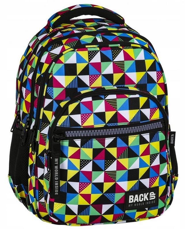 Plecak BackUP model M 34 w intensywne, wielokolorowe wzory geometryczne, przywodzi na myśl kalejdoskop. Ozdobą plecaka jest niezawodny zamek XXL z poręczną i ciekawą zawieszką. Nazwa wzoru: kalejdoskop. Wyposażenie: - 4 główne komory - 1 przednia kieszeń zapinana na zamek XXL - dodatkowa kieszeń np. na telefon z tylnej strony pleców, umożliwiająca szybki dostęp bez zdejmowania plecaka - 2 boczne kieszenie na napój - w pierwszej komorze kieszenie na laptopa i tablet - w przedniej komorze poręczny organizer z 2 kieszeniami na zamek oraz uchwytem na klucze - w przedniej komorze poręczna kieszeń na zamek na drobiazgi - dno plecaka wykonane ze wzmocnionej tkaniny - miękkie, ergonomiczne szelki - wygodny uchwyt do przenoszenia plecaka i dodatkowy uchwyt do powieszenia - ergonomiczne, usztywnione plecy wyprofilowane oddychającą pianką uzupełnione systemem Air Flow - dyskretny odblask z na szelkach - odblaskowa taśma przytroczona do zamka - rozmiar: 41x30x22 cm