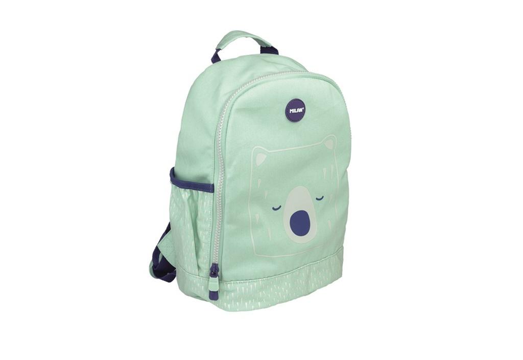 Zielony plecak z nadrukiem sympatycznego zwierzaka Po bokach dodatkowe kieszonki Regulowane miękkie szelki Górny uchwyt do zawieszenia Materiał wierzchni: 100% bawełna