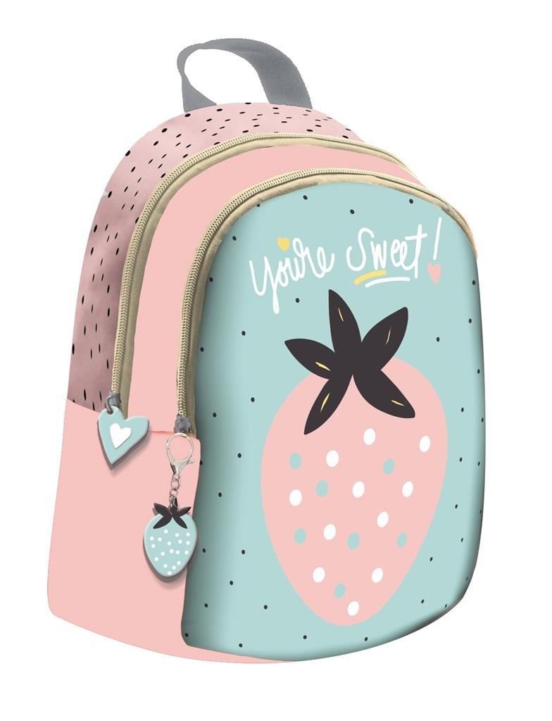 Dwukomorowy mały plecak. Wewnątrz plecaka kolorowa grafika. Dodatkowo zamki zakończone są ozdobnymi zawieszkami, a na szelkach i przodzie plecaka są elementy odblaskowe. Wymiary: 24 x 29 x 14 cm.