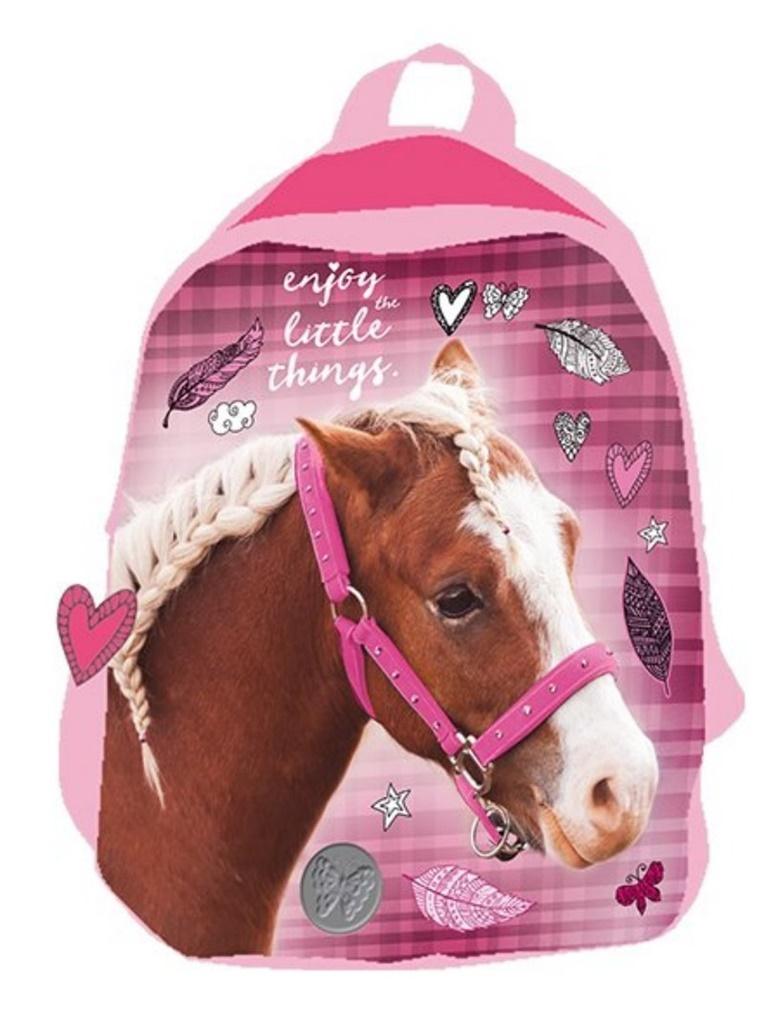 PLECAK MAŁY 2komorowy, na boku posiada kieszonkę z elastycznej siatki. Na froncie plecaka oraz na szelkach znajdują się elementy odblaskowe. Całość wykonana z poliestru, dodatkowo materiał brokatowiony. Wewnątrz plecaka kolorowa grafika. Dodatkowo zamki zakończone są ozdobnymi zawieszkami. Wysokość: 29 cm