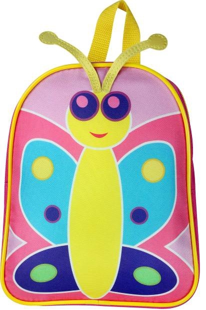 Wymiary: 235 (wys) x 190 (szer) x 80 (głęb) Waga: 100g - żywa kolorystyka, - śliczny motyw motylka z wystającymi czółkami na froncie plecaka, - idealny dla dziewczynki, - regulowane szelki, - uchwyt umożliwiający zawieszenie na wieszaku i noszenie w ręce, - jedna główna komora zapinana na zamek błyskawiczny