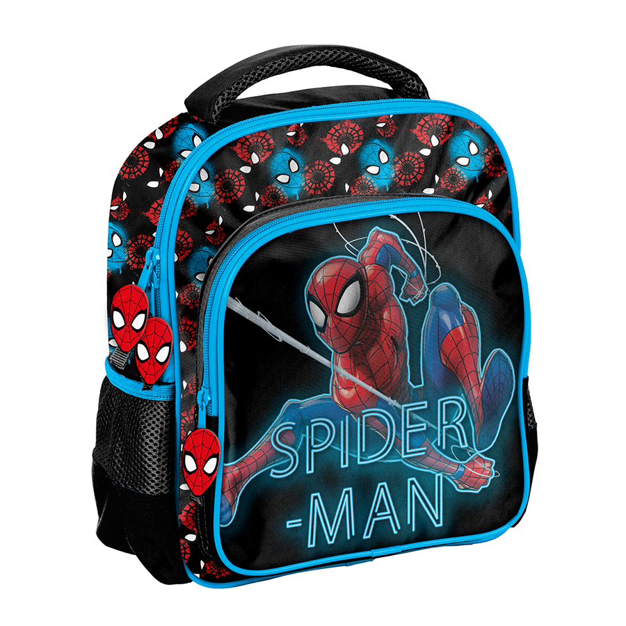 Plecak przedszkolny Spider-Man. Idealny dla dzieci, które idą do przedszkola lub zerówki. Posiada jedną komorę oraz funkcjonalną kieszeń na froncie. Plecak ma lekko usztywnione plecy, uchwyt do przenoszenia oraz regulowane i wyściełane gąbką szelki. Dwie boczne kieszenie z siatki mieszczą bidon, małą butelkę lub termos.