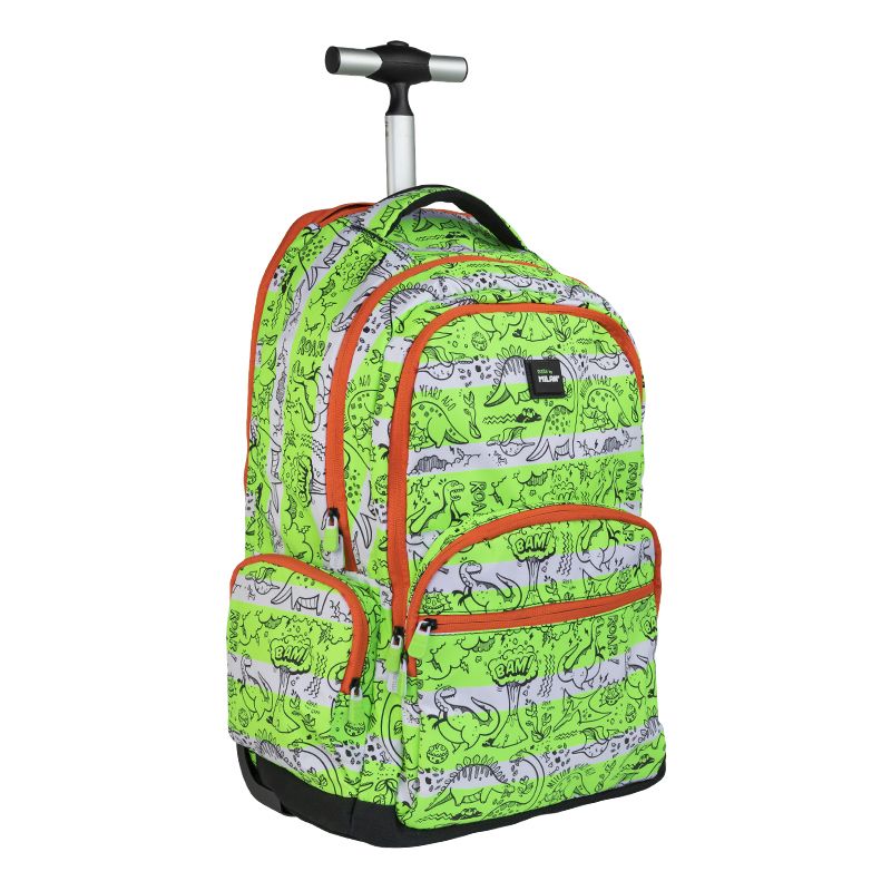 Plecak młodzieżowy MILAN na kółkach z metalową chowaną rączką i z 6 suwakami z kolekcji MILLION YEARS AGO w kolorach fluo: zielonym i białym.