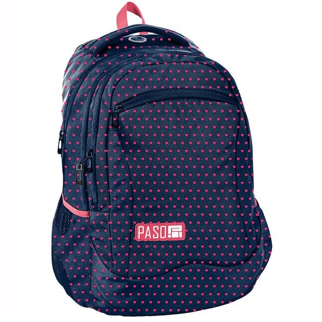 Plecak młodzieżowy, szkolny granatowy w serca. Posiada trzy pojemne komory, kieszeń przednią z organizerem zamykaną na zamek oraz dwie boczne kieszonki wykonane z siatki, które pomieszczą butelkę, bidon czy termos. W komorze głównej znajduje się przegroda (na laptop), w drugiej komorze organizer z kieszenią na zamek oraz uchwyt na klucze. Wzmocnione profilowane plecy oraz miękkie, regulowane szelki sprawiają, że plecak nosi się niezwykle komfortowo. Plecak posiada wygodny uchwyt do przenoszenia, uszko do powieszenia oraz elementy odblaskowe dla zwiększenia bezpieczeństwa na drodze lub po zmroku. Ze względu na swój rozmiar, plecak to idealnie rozwiązanie zarówno dla nastolatków, jak i dla młodszych dzieci. W Paso sięgamy po nowoczesne wzornictwo, nie zapominając o tym, by oferować solidne i praktyczne produkty. Waga: 580 g Rozmiar: 17" 43x31x19