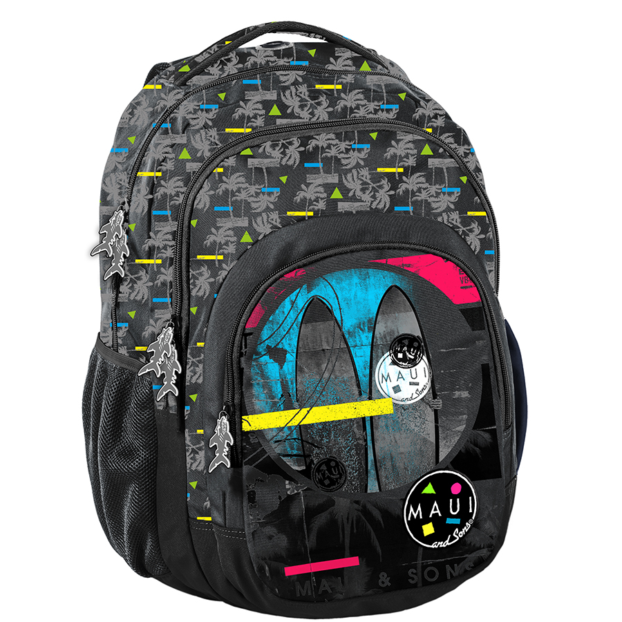 Plecak młodzieżowy Maui and Sons idealny do szkoły. Posiada trzy pojemne komory, kieszeń przednią z organizerem zamykaną na zamek oraz dwie boczne kieszonki wykonane z siatki, które pomieszczą butelkę, bidon czy termos. W komorze głównej znajduje się przegroda (na laptop), w drugiej komorze organizer z kieszenią na zamek oraz uchwyt na klucze. Wzmocnione profilowane plecy evafoam oraz miękkie, regulowane szelki sprawiają, że plecak nosi się niezwykle komfortowo. Plecak posiada wygodny uchwyt do przenoszenia, uszko do powieszenia oraz elementy odblaskowe dla zwiększenia bezpieczeństwa na drodze lub po zmroku. W Paso sięgamy po nowoczesne wzornictwo, nie zapominając o tym, by oferować solidne i praktyczne produkty.