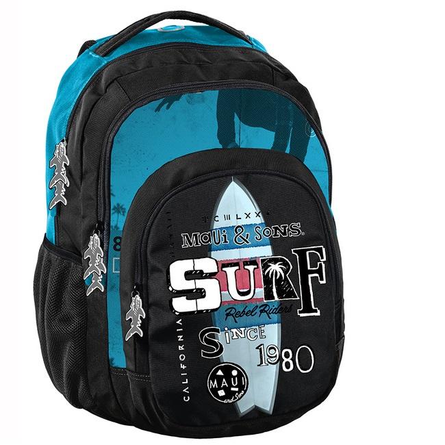 Plecak młodzieżowy Maui and Sons Surf idealny do szkoły. Posiada trzy pojemne komory, kieszeń przednią z organizerem zamykaną na zamek oraz dwie boczne kieszonki wykonane z siatki, które pomieszczą butelkę, bidon czy termos. W komorze głównej znajduje się przegroda (na laptop), w drugiej komorze organizer z kieszenią na zamek oraz uchwyt na klucze. Wzmocnione profilowane plecy evafoam oraz miękkie, regulowane szelki sprawiają, że plecak nosi się niezwykle komfortowo. Plecak posiada wygodny uchwyt do przenoszenia, uszko do powieszenia oraz elementy odblaskowe dla zwiększenia bezpieczeństwa na drodze lub po zmroku. W Paso sięgamy po nowoczesne wzornictwo, nie zapominając o tym, by oferować solidne i praktyczne produkty.