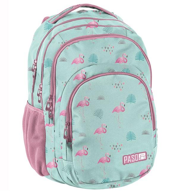 Plecak młodzieżowy flamingi, idealny do szkoły. Posiada trzy pojemne komory, kieszeń przednią z organizerem zamykaną na zamek oraz dwie boczne kieszonki wykonane z siatki, które pomieszczą butelkę, bidon czy termos. W komorze głównej znajduje się przegroda (na laptop), w drugiej komorze organizer z kieszenią na zamek oraz uchwyt na klucze. Wzmocnione profilowane plecy evafoam oraz miękkie, regulowane szelki sprawiają, że plecak nosi się niezwykle komfortowo. Plecak posiada wygodny uchwyt do przenoszenia, uszko do powieszenia oraz elementy odblaskowe dla zwiększenia bezpieczeństwa na drodze lub po zmroku. W Paso sięgamy po nowoczesne wzornictwo, nie zapominając o tym, by oferować solidne i praktyczne produkty.