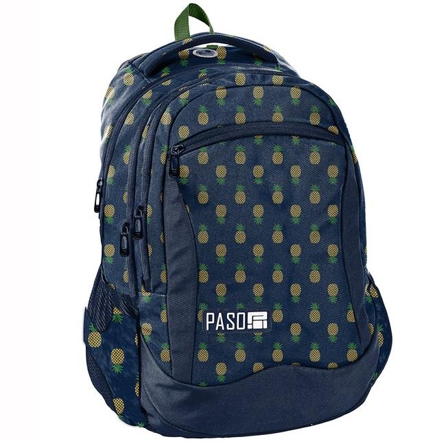 Plecak młodzieżowy, szkolny granatowy w ananasy. Posiada trzy pojemne komory, kieszeń przednią z organizerem zamykaną na zamek oraz dwie boczne kieszonki wykonane z siatki, które pomieszczą butelkę, bidon czy termos. W komorze głównej znajduje się przegroda (na laptop), w drugiej komorze organizer z kieszenią na zamek oraz uchwyt na klucze. Wzmocnione profilowane plecy oraz miękkie, regulowane szelki sprawiają, że plecak nosi się niezwykle komfortowo. Plecak posiada wygodny uchwyt do przenoszenia, uszko do powieszenia oraz elementy odblaskowe dla zwiększenia bezpieczeństwa na drodze lub po zmroku. Ze względu na swój rozmiar, plecak to idealnie rozwiązanie zarówno dla nastolatków, jak i dla młodszych dzieci. W Paso sięgamy po nowoczesne wzornictwo, nie zapominając o tym, by oferować solidne i praktyczne produkty.