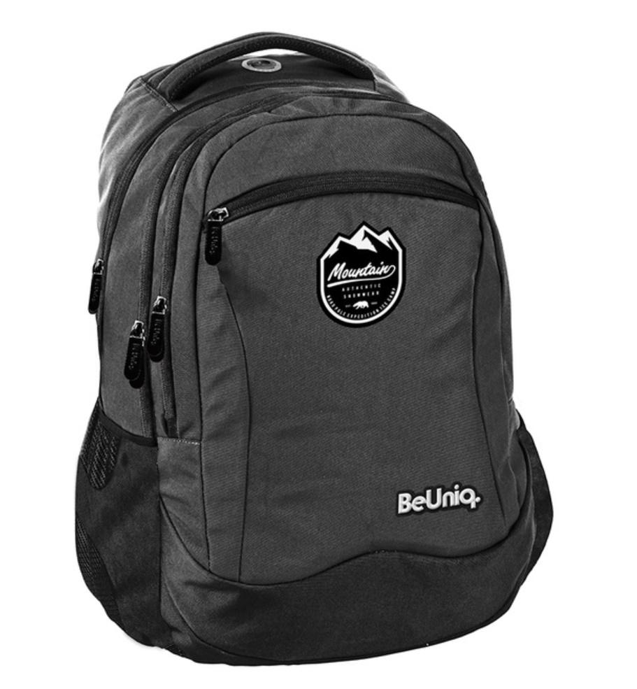 Plecak młodzieżowy BeUniq Mountains. Model ten wyposażony jest w trzy komory, kieszeń przednią z organizerem zamykaną na zamek oraz dwie boczne kieszonki wykonane z siatki oraz materiału, które pomieszczą butelkę, bidon czy termos. W komorze głównej znajduje się przegroda (na laptop), w drugiej komorze organizer z kieszenią na zamek oraz uchwyt na klucze. Wzmocnione profilowane plecy oraz miękkie, regulowane szelki sprawiają, że plecak nosi się niezwykle komfortowo. Plecak wykonany jest z wodoodpornego materiału, dzięki czemu model ten doskonale znosi różne warunki atmosferyczne. Posiada wygodny uchwyt do przenoszenia, uszko do powieszenia oraz elementy odblaskowe dla zwiększenia bezpieczeństwa na drodze lub po zmroku.