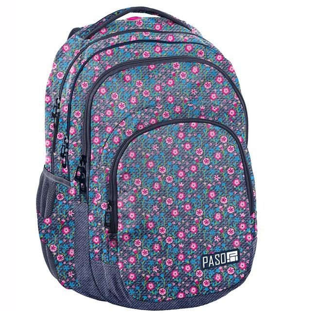 Plecak młodzieżowy, idealny do szkoły w drobne kwiatki. Posiada trzy pojemne komory, kieszeń przednią z organizerem zamykaną na zamek oraz dwie boczne kieszonki wykonane z siatki, które pomieszczą butelkę, bidon czy termos. W komorze głównej znajduje się przegroda (na laptop), w drugiej komorze organizer z kieszenią na zamek oraz uchwyt na klucze. Wzmocnione profilowane plecy evafoam oraz miękkie, regulowane szelki sprawiają, że plecak nosi się niezwykle komfortowo. Plecak posiada wygodny uchwyt do przenoszenia, uszko do powieszenia oraz elementy odblaskowe dla zwiększenia bezpieczeństwa na drodze lub po zmroku. W Paso sięgamy po nowoczesne wzornictwo, nie zapominając o tym, by oferować solidne i praktyczne produkty. Waga: 600 g Rozmiar: 44x32x25