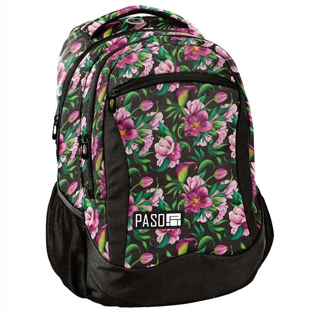 Plecak młodzieżowy, szkolny w kolorowe kwiaty. Posiada trzy pojemne komory, kieszeń przednią z organizerem zamykaną na zamek oraz dwie boczne kieszonki wykonane z siatki, które pomieszczą butelkę, bidon czy termos. W komorze głównej znajduje się przegroda (na laptop), w drugiej komorze organizer z kieszenią na zamek oraz uchwyt na klucze. Wzmocnione profilowane plecy oraz miękkie, regulowane szelki sprawiają, że plecak nosi się niezwykle komfortowo. Plecak posiada wygodny uchwyt do przenoszenia, uszko do powieszenia oraz elementy odblaskowe dla zwiększenia bezpieczeństwa na drodze lub po zmroku. Ze względu na swój rozmiar, plecak to idealnie rozwiązanie zarówno dla nastolatków, jak i dla młodszych dzieci. W Paso sięgamy po nowoczesne wzornictwo, nie zapominając o tym, by oferować solidne i praktyczne produkty.