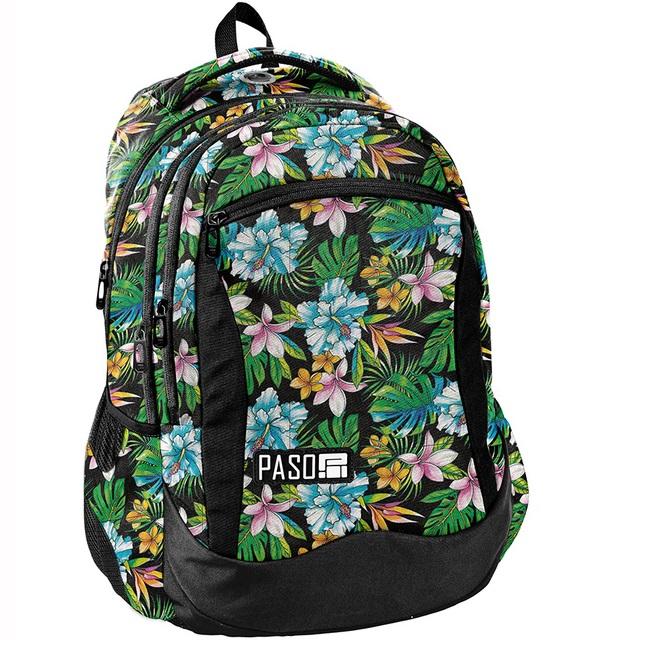 Plecak młodzieżowy, szkolny w kolorowe kwiaty. Posiada trzy pojemne komory, kieszeń przednią z organizerem zamykaną na zamek oraz dwie boczne kieszonki wykonane z siatki, które pomieszczą butelkę, bidon czy termos. W komorze głównej znajduje się przegroda (na laptop), w drugiej komorze organizer z kieszenią na zamek oraz uchwyt na klucze. Wzmocnione profilowane plecy oraz miękkie, regulowane szelki sprawiają, że plecak nosi się niezwykle komfortowo. Plecak posiada wygodny uchwyt do przenoszenia, uszko do powieszenia oraz elementy odblaskowe dla zwiększenia bezpieczeństwa na drodze lub po zmroku. Ze względu na swój rozmiar, plecak to idealnie rozwiązanie zarówno dla nastolatków, jak i dla młodszych dzieci. W Paso sięgamy po nowoczesne wzornictwo, nie zapominając o tym, by oferować solidne i praktyczne produkty. Waga: 580 g Rozmiar: 17" 43x31x19