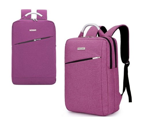 Plecak młodzieżowy z rączką / fioletowy posiada dwie główne kieszenie z przegródkami na dokumenty, telefon, tablet, laptopa, na froncie ukośna kieszonka zapinana na zamek, metalowa rączka, wymiary 30x41x9,5cm