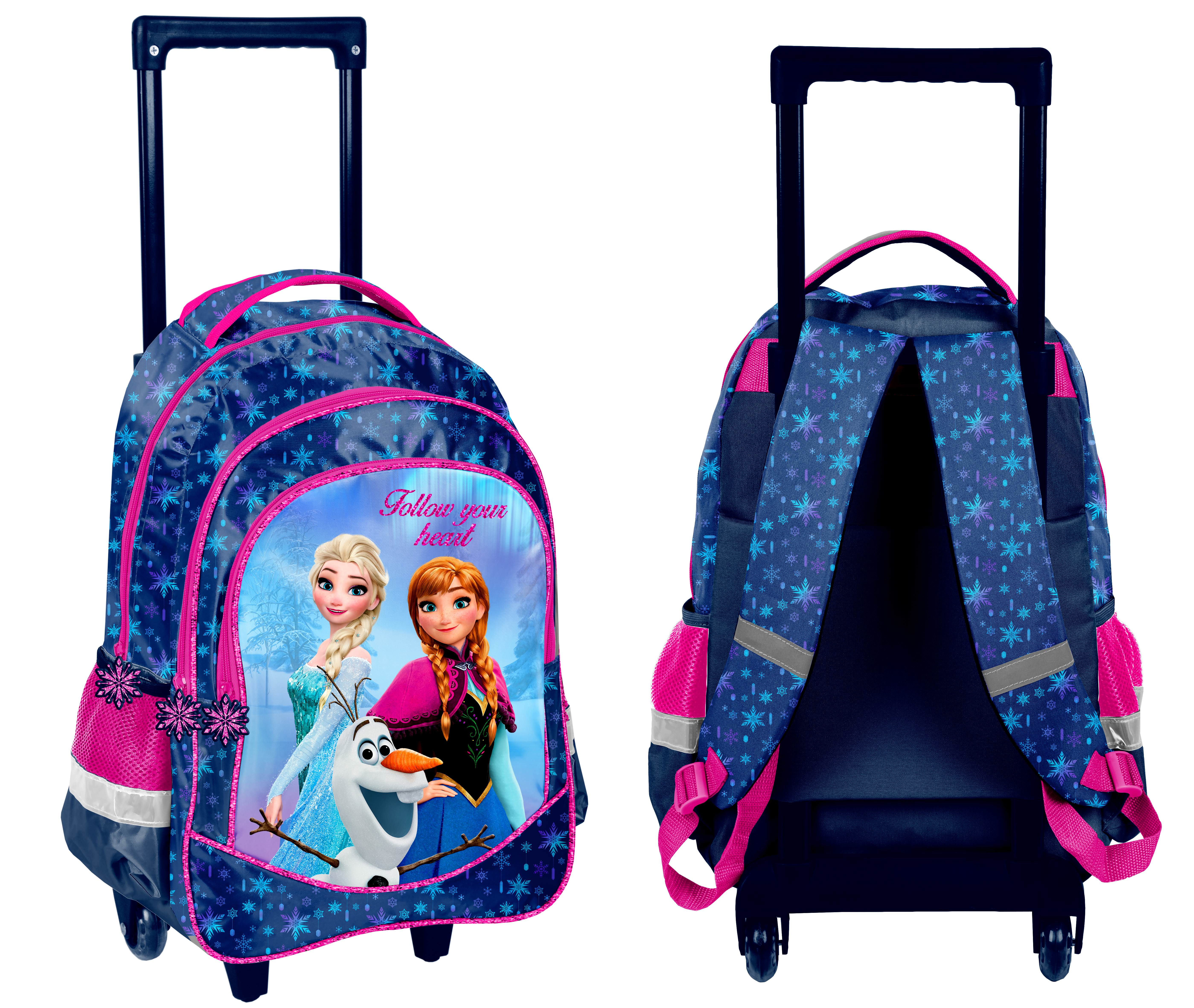 Plecak na kółkach, dwie komory, przednia kieszeń, dwie boczne kieszenie z siatki,regulowane szelki,wzmocnione dno,odblaskowe elementy, regulowana teleskopowa rączka.