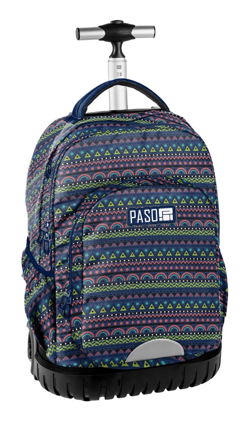 Plecak na kółkach. Dwie pojemne komory, przednia kieszeń z organizerem, dwie boczne kieszonki z siatki. Chowany stelaż z dwustopniową regulacją. Profilowane, wyściełane gąbką szelki, wygodny uchwyt do przenoszenia. Wzmocnione dno, chowana osłonka na kółka. Materiał Polyester Rozmiar 49x32x18