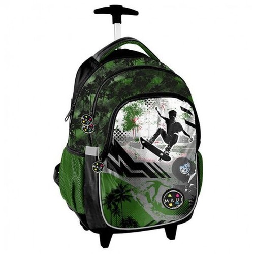Plecak na kółkach Maui and Sons Skater. Posiada dwie duże komory, kieszeń na foncie zamykaną na zamek oraz dwie boczne kieszonki wykonane z siatki, które pomieszczą małą butelkę, bidon lub termos. W trosce o dzieci plecak został wyposażony w odblaskowe elementy zwiększające bezpieczeństwo dzieci na drodze lub po zmroku. Posiada wytrzymałe kółka z PCV, które chronią przed uszkodzeniem dna, które wzmocnione jest dodatkowo gumowanym materiałem. Plecak wyposażony jest w chowany, regulowany stelaż, dla którego została zaprojektowana specjalna osłonka. Posiada miękkie, regulowane szelki oraz aluminiową, teleskopową rączkę, która w wygodny sposób pozwala dostosować plecak do wzrostu Twojego dziecka. Plecak uszyty jest z materiału odpornego na przemakanie. W Paso sięgamy po atrakcyjne i modne dla dzieci wzory, nie zapominając o tym, by oferować solidne i praktyczne produkty. Materiał: Polyester 300x300D