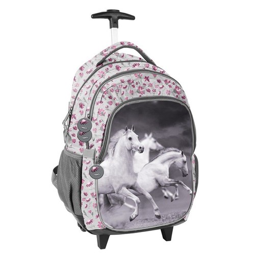 Plecak na kółkach Paso Horse szary w kwiatki. Posiada dwie duże komory, kieszeń na foncie zamykaną na zamek oraz dwie boczne kieszonki wykonane z siatki, które pomieszczą małą butelkę, bidon lub termos. W trosce o dzieci plecak został wyposażony w odblaskowe elementy zwiększające bezpieczeństwo dzieci na drodze lub po zmroku. Posiada wytrzymałe kółka z PCV, które chronią przed uszkodzeniem dna, które wzmocnione jest dodatkowo gumowanym materiałem. Plecak wyposażony jest w chowany, regulowany stelaż, dla którego została zaprojektowana specjalna osłonka. Posiada miękkie, regulowane szelki oraz aluminiową, teleskopową rączkę, która w wygodny sposób pozwala dostosować plecak do wzrostu Twojego dziecka. Plecak uszyty jest z materiału odpornego na przemakanie. W Paso sięgamy po atrakcyjne dla dzieci wzory z ich ulubionymi wizerunkami zwierząt, nie zapominając o tym, by oferować solidne i praktyczne produkty.