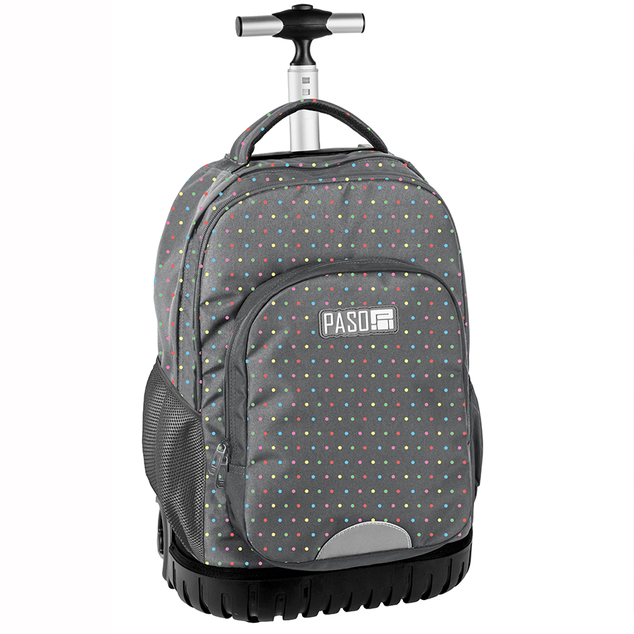 Plecak na kółkach szary w kropki. Posiada dwie pojemne komory, przednią kieszeń z organizerem zamykaną na zamek oraz dwie boczne kieszonki wykonane z siatki, które swobodnie pomieszczą butelkę, bidon lub termos. Plecak wyposażony jest w profilowane, wyścielane gąbką miękkie i regulowane szelki. Konstrukcja plecaka zapewnia chowany stelaż z dwustopniową regulacją, która w wygodny sposób pozwala dostosować uchwyt do odpowiedniego wzrostu. Plecak posiada wygodny uchwyt do przenoszenia, duże, solidne kółka oraz chowaną osłonkę na kółka. Dno plecaka jest super usztywniane i wzmocnione. W Paso dbamy o to, aby najwyższa jakość szła w parze z bieżącymi trendami, a produkty były praktyczne i funkcjonalne.