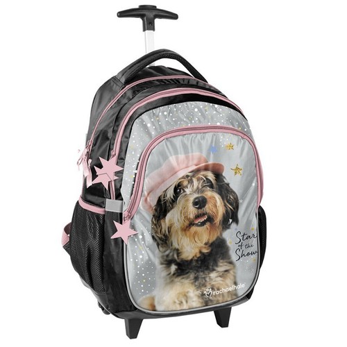 Plecak na kółkach Rachael Hale szaro-różowo-czarny. Posiada dwie duże komory, kieszeń na foncie zamykaną na zamek oraz dwie boczne kieszonki wykonane z siatki, które pomieszczą małą butelkę, bidon lub termos. W trosce o dzieci plecak został wyposażony w odblaskowe elementy zwiększające bezpieczeństwo dzieci na drodze lub po zmroku. Posiada wytrzymałe kółka z PCV, które chronią przed uszkodzeniem dna, które wzmocnione jest dodatkowo gumowanym materiałem. Plecak wyposażony jest w chowany, regulowany stelaż, dla którego została zaprojektowana specjalna osłonka. Posiada miękkie, regulowane szelki oraz aluminiową, teleskopową rączkę, która w wygodny sposób pozwala dostosować plecak do wzrostu Twojego dziecka. Plecak uszyty jest z materiału odpornego na przemakanie. W Paso sięgamy po atrakcyjne dla dzieci wzory z ich ulubionymi wizerunkami zwierząt, nie zapominając o tym, by oferować solidne i praktyczne produkty. Waga: 1200 g Rozmiar: 45x29x24 Materiał: Polyester 300x300D