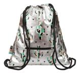 1 komora główna ściągana na sznurek 1 kieszeń zewnętrzna zapinana na suwak grube sznurki-szelki do noszenia na plecach wymiary: (wysokość) 45 cm, (szerokość) 38 cm waga: 250 g materiał z efektem glitter: poliester / bawełna