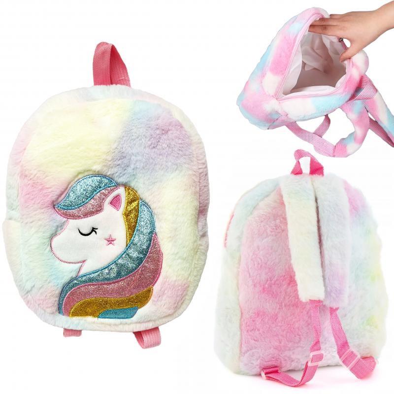 Plecak jednorożec zapinany na zamek. Wykonany z pluszowego materiału w kolorach pastelowych.