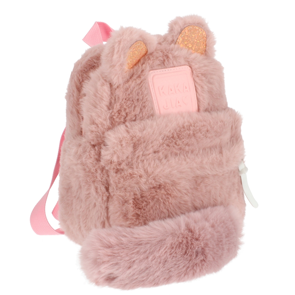 Zalety produktu pluszowy materiał, regulowane szelki, uchwyt do powieszenia plecaka na wieszaku, posiada jedną komorę zasuwaną na zamek oraz małą kieszonkę również na zamek błyskawiczny, plecak posiada doczepiony ogonek kotka.