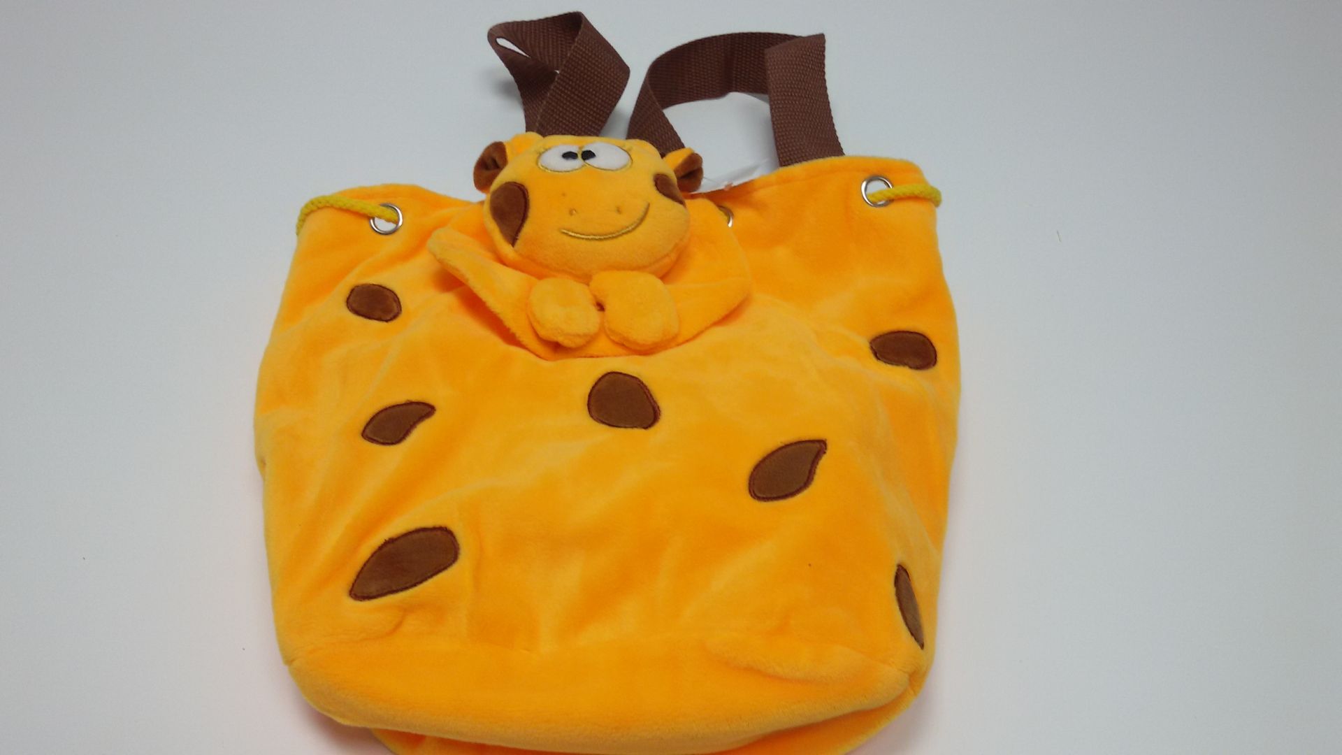 Plecak pluszowy żyrafa. W środku dodatkowa kieszonka zamykana na zamek.Regulowana długość pasków na ramiona. Klapka zamykana na rzep i dodatkowo sznurek ze ściągaczem. Nie wymaga wiązania. Wymiar 20 x 25 cm.