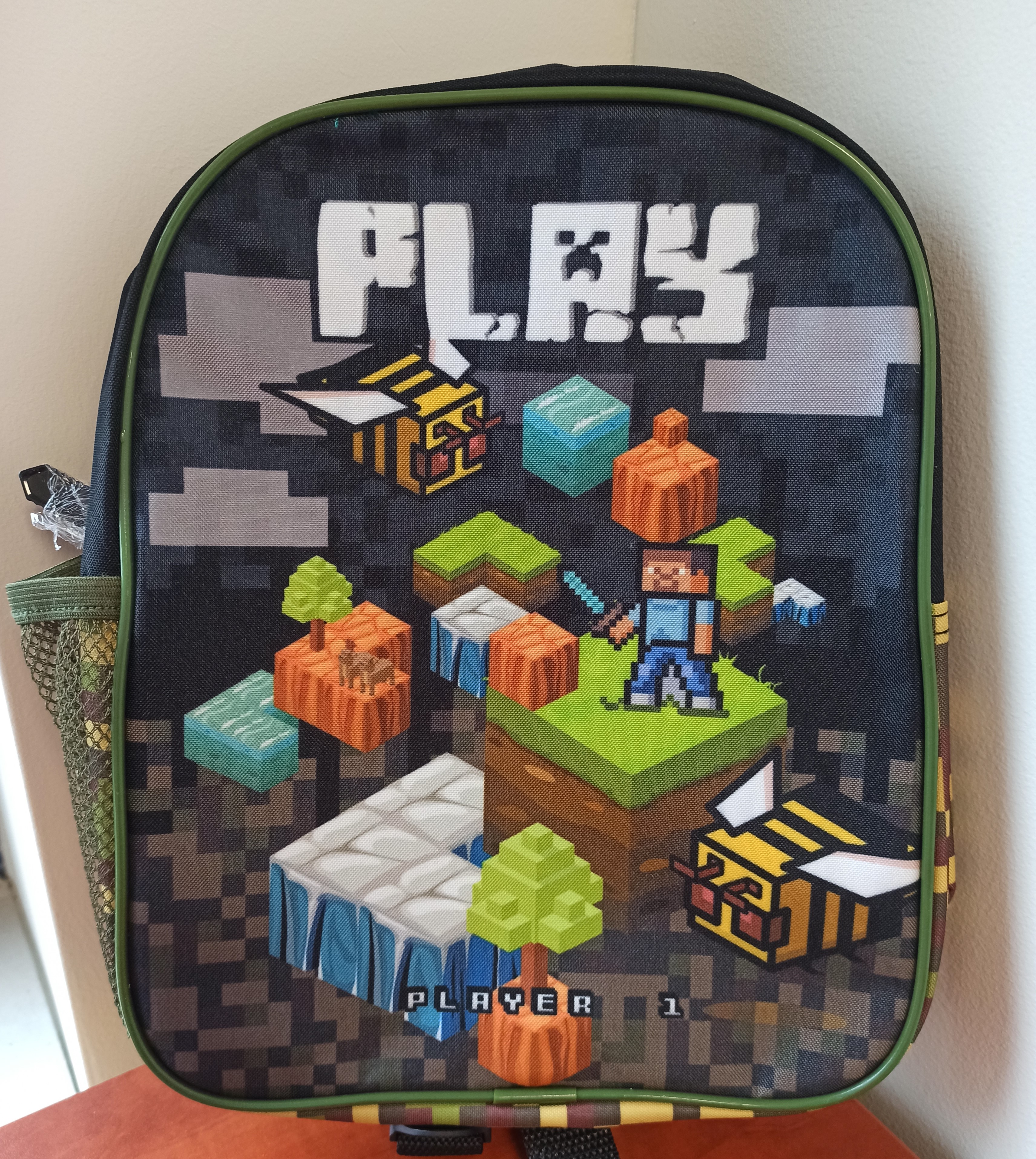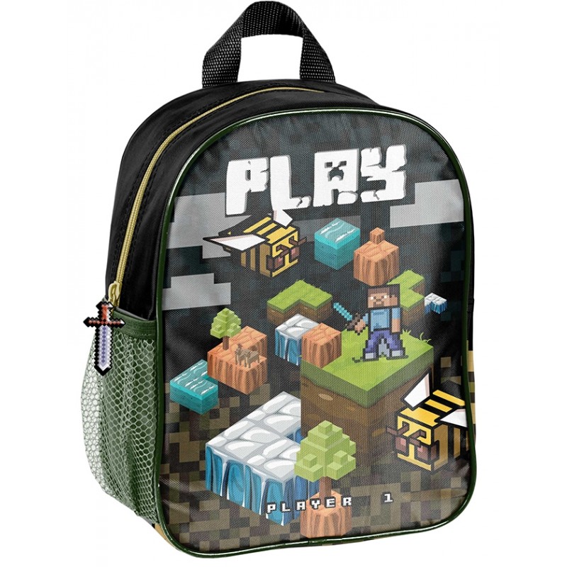 Mały plecak przedszkolny, jedna komora, jedna boczna kieszeń z siatki (mieści małą butelkę, bidon lub termos). Regulowane szelki, wygodny uchwyt do przenoszenia.