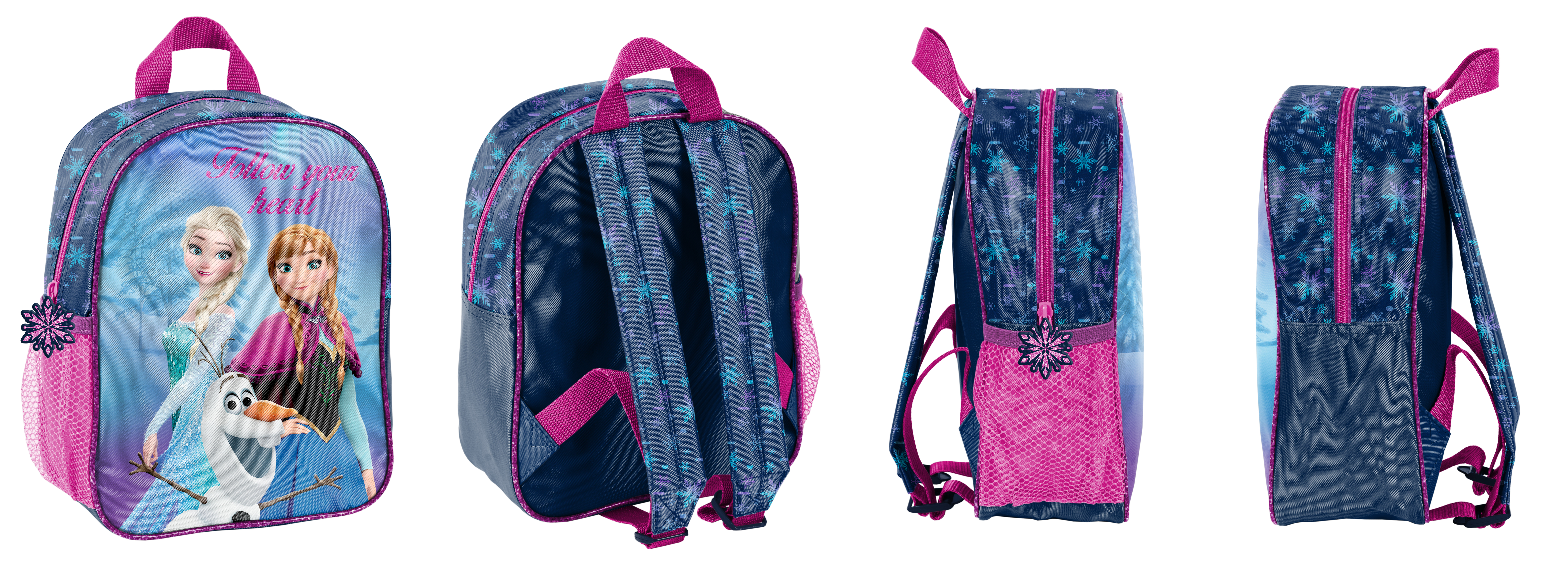Mały plecak przedszkolny, jedna komora, jedna boczna kieszeń z siatki (mieści małą butelkę, bidon lub termos). Regulowane szelki, wygodny uchwyt do przenoszenia.