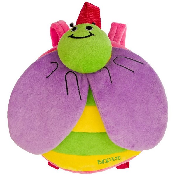 Plecak zasuwany od góry, a na froncie uśmiechnięta pszczółka w kolorowe pasy ze skrzydełkami.