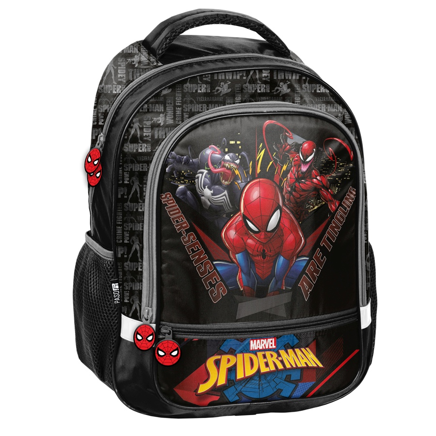 Plecak szkolny Paso Spider-Man. Produkt składa się z dwóch dużych komór, kieszeni na froncie oraz z dwóch bocznych kieszonek wykonanych z siatki. W kieszonkach z łatwością pomieści się termos czy bidon. Elementy odblaskowe umieszczone na plecaku sprawiają, że dziecko będzie jeszcze bardziej widoczne, a co za tym idzie – bezpieczne. Usztywniane gąbką, ergonomiczne wyprofilowane plecy oraz regulowane szelki pokryte miękkim materiałem zapewniają dziecku prawidłową postawę i odciążają kręgosłup. Dzięki tym cechom plecak jest bardzo komfortowy a noszenie podręczników oraz zeszytów jest niezwykle wygodne. Plecak wyposażony jest w wygodny uchwyt do przenoszenia oraz usztywnione dno, wzmocnione i zabezpieczone gumowymi stopkami. Wygodne ozdobne pullery ułatwiają odpinanie zamków. Plecak uszyty jest z materiału odpornego na przemakanie. Waga: 500 g Rozmiar: 41x31x15 cm Materiał: polyester Pojemność: 19 L
