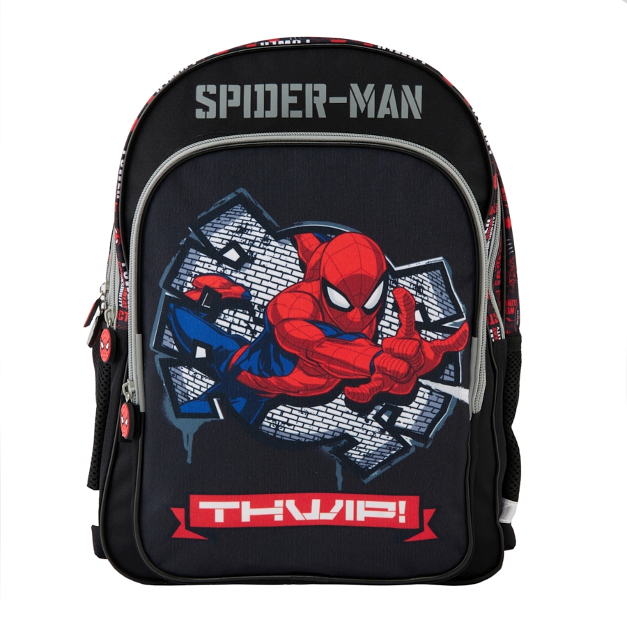 Plecak szkolny. Dwie duże komory zapinane na zamek, jedna bardzo obszerna kieszeń na śniadanie, boczne kieszenie z siatki (mieści się butelka, mały termos lub bidon).