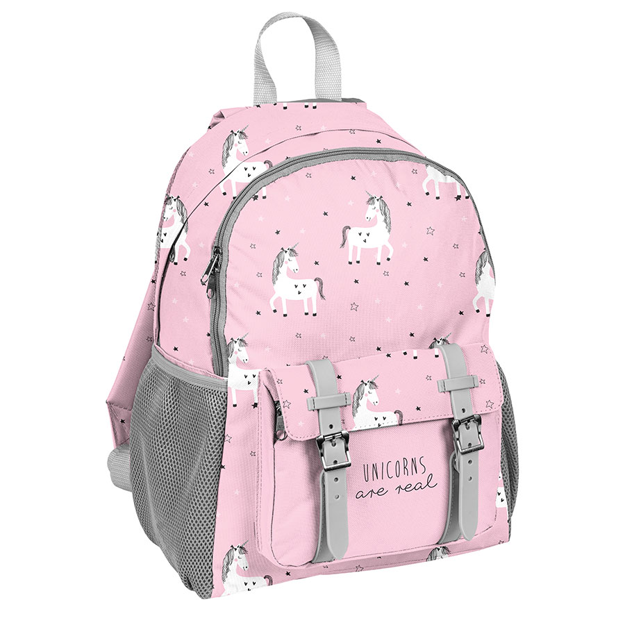 Plecak szkolny. Wyposażony w dwie pojemne komory oraz boczne kieszonki wykonane z siatki na bidon lub termos. Na froncie znajduje się zamykana na zamek kieszeń z dodatkowymi ozdobnymi klamrami zapinanymi na magnes. Plecak posiada wzmocnione, profilowane plecy, miękkie, regulowane szelki oraz wygodne uszko do powieszenia i ozdobne pullery.